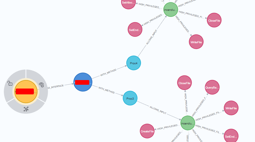 Viewing this relationship is only possible because we combined both our fuzzing input and the Process Monitor results into the same Neo4j database. In the above example, a file is being written with our user input provided as NT AUTHORITY\LOCAL SERVICE.
