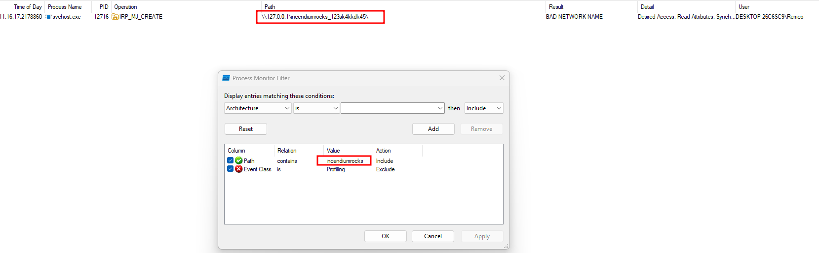 By default, the value for the canary is incendiumrocks. But you can change this while fuzzing using the -Canary argument with Invoke-ComFuzzer. Make sure to change the canary value for Import-ProcMonCsv as well if you changed this.