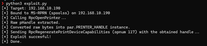 Our exploit will need to first call RpcOpenPrinter (opnum 1), store the context handle and then call RpcRegeneratePrintDeviceCapabilities (opnum 117). The Impacket dcerpc v5 RPRN functionality does implement RpcOpenPrinter, but not RpcRegeneratePrintDeviceCapabilities. So we need to implement that class ourselves.